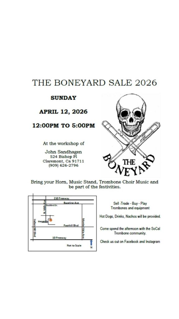 Trombone players of all levels are all invited to John’s workshop for an afternoon of everything trombone. Come meet trombone players from all over Southern California and beyond, you never know who is going to show up. You can buy, sell, trade and play trombones from other trombone enthusiasts. Bring your horn, music stand sheet music for a crowd and anything music related you want to trade or sell. There are always the traditional Nachos and Hotdogs to lure you in if the trombones aren’t enough.